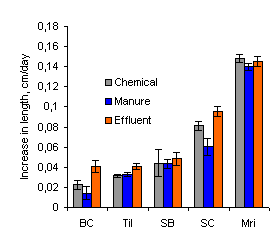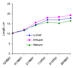grew faster in ponds fertilized with effluent than with manure, but the degree of response