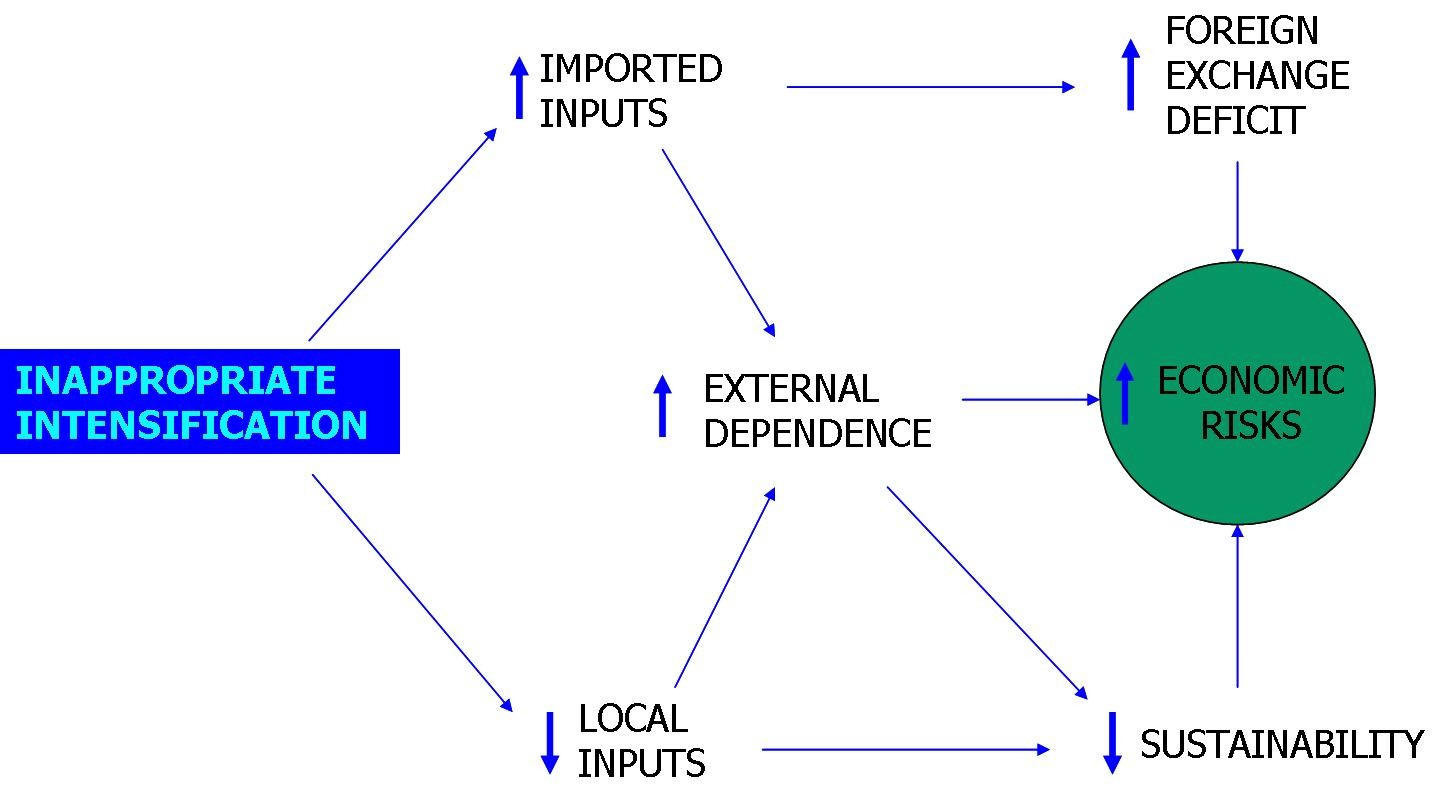 Intensive animal production systems based on imported genetics, technologies and feeds are also economically unsustainable (Figure 2). They are first subjected to changes in price and availability of the inputs, to say nothing of difficulty marketing products in the changeable international markets. Under certain conditions the producers can earn much profit by using low-priced imported feeds, but their businesses are vulnerable to any economic instability (Le Viet Ly 2000). These intensive systems will generally increase foreign exchange deficit due to high imports. In addition, the producers need to have high management skills and technical expertise, whereas the margins gained may be small. Another factor contributing to economic risks for these intensive systems is the introduced exotic animals being highly susceptible to diseases and vulnerable to hardship under unfavorable tropical climate conditions. The dangers of introducing inappropriate imported technologies have been well illustrated in the recent economic crisis in other South-East Asia countries. For example, in Indonesia 80% of the poultry industry went bankrupt causing many problems of food supplies and malnutrition (Orskov 2001).