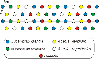 Characteristics of the proposed silvo-pastoral system were as follows: trees were planted in 10 m wide strips, with four rows, prepared across the slope and separated by 30 m wide strips without trees; the herbaceous forages are sown in the whole area. The treatments compared were two methods of establishment: Method 1) Simultaneous planting of trees and herbaceous forages; tree strip protection with wire fences, and grazing after the herbaceous forages establishment; Method 2) Planting of tree seedlings and of pigeon peas (Cajanus cajan) in the first rainy season; sowing of the herbaceous forages plus maize in the second rainy season; grazing after maize harvest and pasture establishment. In addition, tree species in the strips were planted in two different combinations: Combination A) Eucalyptus grandis and Acacia mangium, spaced 3 m x 4 m, total of 100 trees/ha of each species. Combination B) Eucalyptus grandis, Acacia mangium, spaced 3 m x 6 m, total of 68 trees/ha of each species; Mimosa artemisiana, Acacia angustissima and a hybrid Leucaena leucocephala x Leucaena diversifolia, which were planted alternatively between Eucalyptus grandis and Acacia mangium trees in a row, with a total of 42 trees/ha of each species, and a final spacing for tree combination "B" of 3 m x 3 m (Figure 1). Mimosa artemisiana is a fast growing native legume tree species. The main objective of the present study was to compare the two methods of establishment.