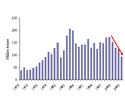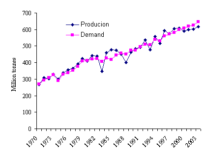 Apart from the economic and environmental implications, of producing alcohol, there is the direct competition with food and feed supplies. both, it is apparent that many countries, and especially the USA are pursuing the alcohol option. Estimates in the USA are that by 2010 some 50 million tonnes of grain will be converted to alcohol (Figure 4) – this is close to the present exportable grain surplus (about 60 million tonnes) from that country. The related problem is that, as is the case with oil, world demand exceeds the supply (Figure 5), with the result that world stocks have steadily declined over the past few years (Figure 6).