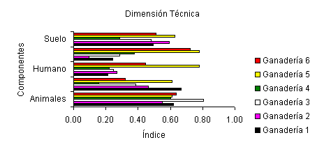 Las ganaderías que tienen mejor índice en el aspecto social son la 1 y 3, con valores de 0.87 y 0.86 respectivamente. Esto es muy importante porque en la medida en que el personal sea más estable, esté mejor remunerado y tenga acceso a los beneficios sociales, se asegura en gran manera la continuación productiva del sistema. Sin embargo ambos sistemas tienen índices bajos a intermedios para las dimensiones técnica (0.50 y 0.49 respectivamente) y económica (0.45 y 0.46 respectivamente).
