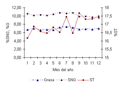 Las variables fisico-químicas fueron analizadas utilizando un análisis de varianza con los efectos año, mes y la covariable la cantidad de leche en el día de la muestra, fue utilizado el Proc GLM del paquete estadístico SAS (1999).