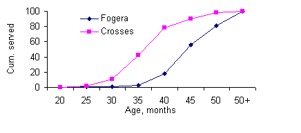 The cumulative proportion of F1 heifers reaching puberty is constantly higher than for the pure Fogera heifers till they reach the age of 45 months and above (Figure 1), indicating that crossbred heifers reach puberty earlier than the purebred heifers.