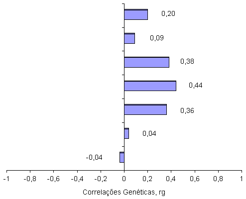 Os coeficientes de correlação genética entre o temperamento e as características de desempenho produtivo analisadas neste trabalho estão apresentados na Figura 2 e na Tabela 5. Os valores encontrados neste trabalho sugerem um relacionamento favorável entre o Temperamento e características de desenvolvimento ponderal. Este comportamento é coerente com os relatos de Burrow e Dillon (1997) e Voisinet et al (1997).