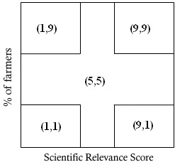 Plotting the scientific relevance score on the horizontal axis and the percentage of the farmers practicing the ethnoveterinary practice on vertical axis and dividing both the axes in nine equal parts the shortlisting grid with eighty-one combinations can be drawn (Figure 1). To be economical both in terms of time and resources, broadly following five combinations may be considered:
