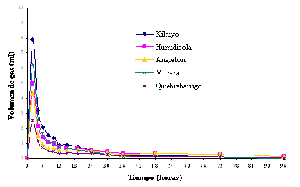 El forraje que presentó el mayor volumen de gas fue el pasto kikuyo, mientras que el quiebrabarrigo presentó el menor volumen durante todo el período de evaluación. El Brachiaria produjo menos gas que el pasto kikuyo y la morera hasta las 24 horas, horario en el cual tiene una producción similar a la morera de 90.64 ml y en el último horario es similar a la del Kikuyo (162.59 ml). Por otro lado, la morera disminuye la producción de gas a partir de las 24 horas hasta el final de la fermentación, siendo menor incluso que la del heno de angleton (117.40 Vs 137.39 ml). El volumen acumulado estimado por la ecuación para los forrajes kikuyo, bracharia, angleton, morera y quiebrabarrigo en general, muestran una tendencia muy marcada en forma de asintótica (Tabla 2).