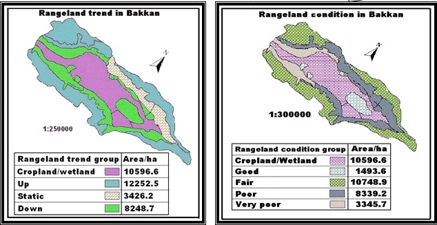 The results indicate that only 6.2% of the rangeland is in good condition and the rest are in fair (44.9%), poor and very poor (48.9%). About half of the rangeland area shows a positive trend, but are situated a long distance from the watering points, so are not favorable for grazing animals. The range condition situation and its trend in consideration of soil and slope properties in this study indicates that the rangeland in Bakkan is a fragile production system, sensitive to soil erosion and rangeland degradation, so for a long time sustainable exploitation should be goes to minimize land degradation in the future, proper management and sustainable exploitation should be implemented in the future