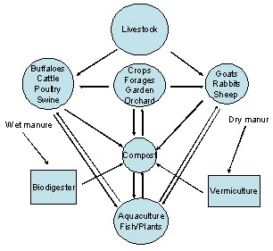 Specifically, all farming activities or components should be complementary, for example, using animal manures for compost to add to forage and garden plots, fish ponds, and(or) worm bins, while fresh-cut feedstuffs from forage and garden plots and edible kitchen scraps are fed to rabbits and other livestock (Figure 2).