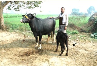 A six year old buffalo which was a repeat breeder for one year conceived and delivered calf on application of first protocol (1st photograph). Similarly a nine year old KF cross breed cow was a repeat breeder. This cow was treated according to the second protocol. A female calf was born. (2nd photograph). The dam is producing 16 kg/day.of milk. A ten year old buffalo which did not conceive for six years was treated according to the third protocol. A female calf was delivered. (3rd photograph).