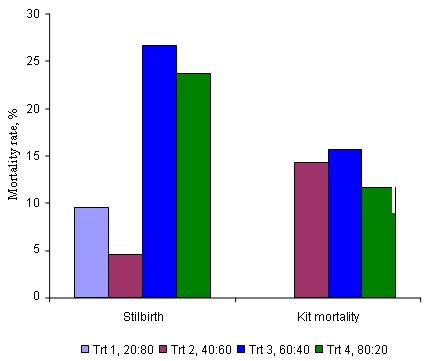 Percent stillbirth (Figure 5) was higher (24-25%) for 60:40 and 80:20 treatments than 20:80 (9%) and 40:60 (4%) treatments. Kit mortality was 10-16% for 60:40, 40:60 and 80:20 while 20:80 treatment maintained their kits after birth to 7 days postpartum.