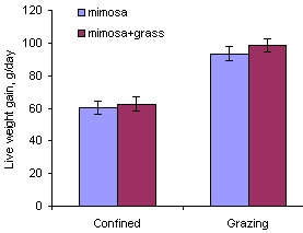 The higher growth rates of goats grazing Mimosa compared with being fed the foliage in confinement could be due to increased opportunity for selection of the leaves, and their “freshness”, in the former system. The effect of supplementation with grass was different between Experiments 2a and 2b, with an indication of poorer growth rate when the Mimosa was supplemented with grass in the former and no difference in the latter experiment. However, conditions were different in that in Experiment 2a, the goats were confined individually in metabolism cages with restricted movement, while in Experiment 2b they were in a pen with greater freedom of movement.
