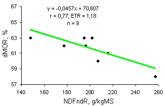 Figure 5. Relation entre la digestibilité de la matière organique (dMO %) et les teneurs en NDF non digestibles (NDFnd en g/kg MS) des rations composées de Balanites aegyptiaca et de foins |