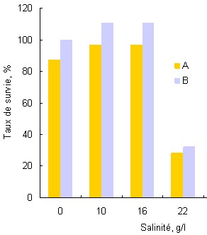 Jusqu’à 17‰, le transfert direct de l’eau douce à l’eau salée se traduit par un taux de survie élevé (84,3% à 96,8%). Au-delà de 17‰, les mortalités sont importantes. En revanche, lorsque le transfert est réalisé de façon progressive, de fortes salinités (30‰) peuvent être atteintes, avec un taux de survie élevé (78 à 81%). Le transfert progressif, par délai de 2 jours, semble meilleur en terme de gain de temps que ceux de 4 jours et de 6 jours.