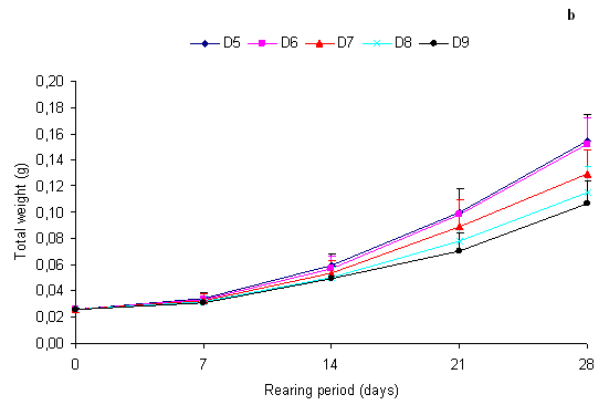 Survival rate was also significantly (P < 0.05) affected by the stocking density. This rate decreased with increasing stocking density. The means survival rates are summarised in Table 2. In all treatments, larvae did not exhibit cannibalism during this experiment. Mortality would be due to the natural death and to the manipulations during the weekly samplings.