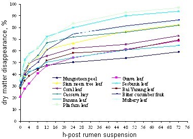 Two, ruminally fistulated crossbred beef steers of 400±15 kg BW were used to evaluate the nutritive value of local plants by using the in sacco nylon bag technique. A Randomized Complete Block Design (RCBD) was used to determine ruminal degradability of DM and OM, and their effects on rumen ecology in cattle. The investigation was carried out with eleven local plants, namely: mangosteen (Garcinia mangostana) peel of fruit (MSP), guava (Psidium guajava) leaf (GVL), siam neem tree (Azadirachta indica) leaf (SNTL), sesbania (Sesbania grandoflora) leaf (SBNL), coral leaf (Eritrina variegate) (CRL), Bai Yanang (Tiliacora triandra) (BY), cassava hay (Manihot esculenta, Crantz) (CH), bitter cucumber (Mormormdica charantia) fruit (BCF), banana (Musa sapientum) leaf (BNL), mulberry (Morus indica) leaf (MBL), and Plia farn (Macropanax dispermus Ktze) leaf (PFL). Approximately 5 g of feed samples were weighed into duplicated nylon bags (38 µm pore size) and incubated ruminally at 0, 2, 4, 8, 12, 24, 48, and 72 h-post feeding.