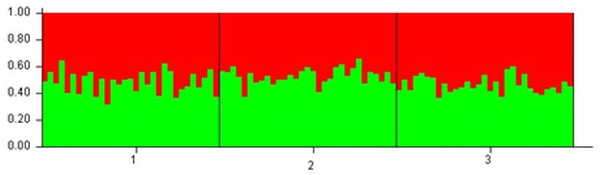 The likelihood values and variance are presented in Table 2 and Figure 1 and Figure 2. The best value of Ln P(D) (-10067.7) was obtained for K = 2, for microsatellite markers.