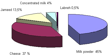 The processing capacity of dairy factories in Jordan is 564 650 tons per day (Kelany 1997). About 95% of produced milk is delivered to dairy factories of which 52% is provided by the Dairy Breeders Association located in Zarqa region in the eastern part of the country and 16% comes from big dairy farms that own their dairy factories. Individual dairy farmers deliver 32% of processed milk. About 92.7% of delivered milk comes from dairy cows, while the rest comes from sheep and goats. Milk from sheep and goat is basically processed to white cultured cheese and Jameed.