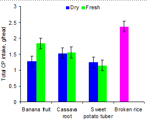 The carbohydrate components accounted for 81% of the total DM intake and 29% of the duckweed intake (Figure 2). Among the carbohydrates, the fresh sweet potato tubers and cassava roots were consumed in similar quantities (together accounting for almost all the intake of the carbohydrate component) with fresh banana fruit being eaten in insignificant amounts (Table 4).