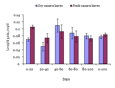 There was 100% survival of the fish on all treatments, indicating there was no hazard from giving the fresh cassava leaves to growing Tilapia. These findings are in agreement with the results of Du Thanh Hang and Preston (2005), Chhay Ty and Preston (2006) and Chhay Ty et al (2005a,b and 2009) in other non ruminant species (pigs) that health and production responses are not related with levels of ingestion of HCN precursors.