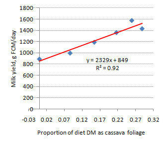 Relationship between milk yield and proportion of diet DM as cassava hay in goats fed a basal diet of urea-sprayed rice straw, a molasses block and cassava root |