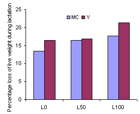 DM and nutrient intakes were not affected by treatment in gestation. Litter size at birth was not influenced by dietary treatment, but mean piglet live weight and total litter live weight (LW) at birth were significantly lower (P<0.05) in treatment 100L for Y sows. Treatment 100L resulted in significantly lower mean piglet and total litter weaning weight for both MC and Y sows, but the differences between 0L and 50L were not significant. Sow feed consumption to produce 1 kg of piglet at weaning was higher in treatment 100L than in 0L and 50L. Sow LW losses during the lactation period, and weaning to service interval, were higher for treatment 100L for both MC and Y sows. The differences for all other parameters measured between 50L and 0L were small and non-significant.