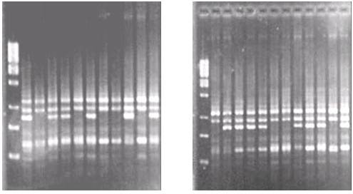 The amplification products were separated by electrophoresis on 2% agarose gels in 0.5x TBE buffer in the presence of ethidium bromide (0.5µg/µl) for 2.5 hours at 100 V. A 1 Kb DNA (Promega® USA) was used as molecular size marker. The RAPD patterns were visualized by UV illumination and the images of each gel were photographed for documentation and further analysis.