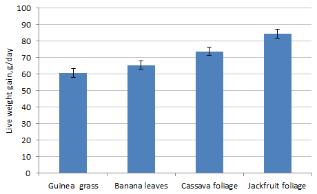 | Figure 1. Effect on live weight gain of goats of supplementing ad libitum Tithoniia foliage with Guinea grass, banana leaves or fresh foliage of cassava or Jackfruit |
