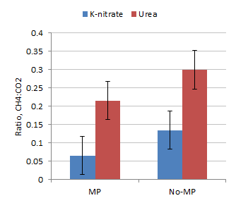 Figure 1. Effect of potassium nitrate compared with urea on the ratio of methane to carbon dioxide in eructed breath of sheep fed a forage-based diet with (MP) and without (No-MP) mangosteen peel |