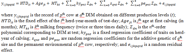 Total of test-day records for first lactation Holstein cows from 2001 to 2010 were extracted from the Animal Breeding Center database at Karaj, Iran. Records were edited on the following criteria: cows with known sires and having age at first calving from 21 to 46 month, edits excluded irregular data for daily milk yield (<1.0 and >75 kg), fat percentage (<1.5% and >9%), and protein percentage (<1% and >7%), cows were required to have a minimum of five test-day (TD) records between 5 and 305 days in milk (DIM) and herd-year of calving subclasses with at last 10 cow records. Additional data edits eliminated sires that had progeny in fewer than three herds and herds that used fewer than three sires.