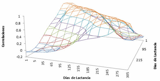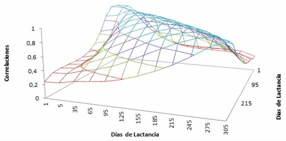 | Figura 6: Correlaciones fenotípicas para días en leche obtenidas con un modelo de regresión aleatoria para producción de leche en vacas Holstein de primer parto de Antioquia. |