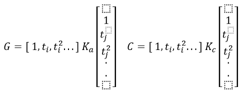 Donde Ka es la matriz de covarianza de los coeficientes de regresión aleatoria genético aditivo, Kc es la matriz de covarianza de los coeficientes de regresión aleatoria de ambiente permanente. A es la matriz que relaciones genéticas aditivas, INd es una matriz identidad de dimensión Nd y R es una matriz diagonal que contiene las varianzas residuales.