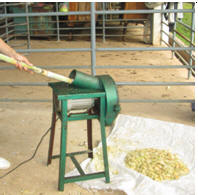 Muntingia, water spinach and sugar cane were collected daily from areas around Souphanouvong University. The Muntingia and water spinach were hung in bunches above the feed trough. The biochar was produced by burning rice husks in a top lit updraft (TLUD) gasifier stove (Olivier 2010). The biochar was mixed with the sugar cane which was chopped (Photo 2) and offered in a plastic bucket at 10% of diet DM. The Muntigia foliage was fed ad libitum; water spinach was offered at 30% of diet DM intake. Feeds offered and residues were weighed every morning.