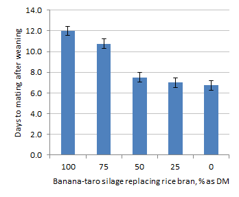 | Figure 8. Effect of replacing rice bran with ensiled mixture of banana pseudo-stems/taro foliage on days to mating after weaning | Figure 9. Effect of replacing rice bran with ensiled mixture of banana pseudo-stems/taro foliage on length of reproductive cycle | Figure 10. Effect of replacing rice bran with