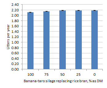 The period from weaning to mating was increased when the taro-banana silage replaced rice bran. As a result the reproductive cycle was longer and the predicted numbers of litters per year was deceased as the taro-banana silage replaced the rice bran (Figuures 8-10)