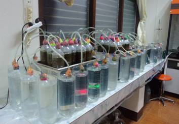 | Photo 1. The in vitro fermentation system using recycled water bottles and water displacement to measure gas production |