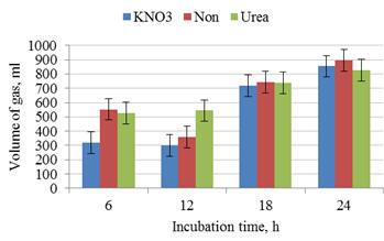 The aim of this study was to evaluate the effect of potassium nitrate or urea on methane production from Mimosa and Gliricidia leaves in an in vitro incubation system with molasses as the energy source. The incubation was for 24 h with measurements of total gas and methane concentration over incubation periods (separate experiments) of 6, 12, 18 and 24 hours and determination of residual unfermented substrate at the end of each experimental period.