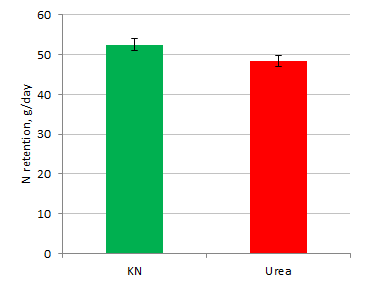 On the assumption that the protein content of live weight gain in young cattle is about 20% (NRC 2000), then for daily N retentions of 52.5 and 48.4 g (on nitrate and urea respectively), the predicted live weight gains are 1641 g/day (52.5*6.25/0.20) and 1513 g/day (48.4*6.25/0.20) on nitrate and urea, respectively. Such estimated rates of growth are probably at least twice what might be achieved in the young "Yellow" cattle used in the present experiment.