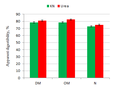 Coefficients of apparent digestibility for DM and OM were lower on the nitrate diet than on the urea diet (Table 5; Figure 1).