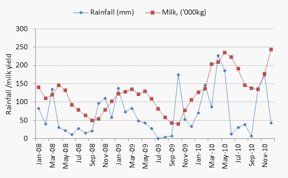 | Figure 3: Monthly rainfall and milk production one month later. |
