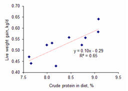| Figure 10. Relationship between dietary crude protein level and live weight gain (data for four provinces) |