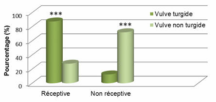 Les résultats, obtenus sur un total de 172 observations, indiquent une indexation à 3 niveaux de réceptivité sexuelle, basée sur les caractéristiques morphologiques externes de la vulve. Le taux maximal d’acceptation du mâle est observé pour les vulves rouge ou rose et turgescentes et minimal pour la vulve blanche non turgescente (respectivement 100 et 96,6 vs 14,1%, p<0,001). Pour les autres catégories de vulves (rouge non turgescente, rose non turgescente, violet turgescente et blanche turgescente), les taux d’acceptation du mâle sont respectivement de 50%, 52,9%, 50% et 50% (p>0,05). Les femelles à vulve violette non turgescente ont présenté un faible taux d’acceptation de la saillie (25%). Par ailleurs, 87,5% des lapines ayant une vulve turgide ont accepté la saillie contre 28,8% chez les femelles ayant une vulve non turgide (p<0,001).
