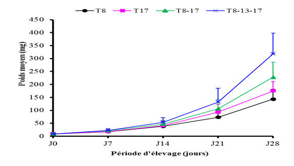 Le poids des larves a été influencé par la fréquence de nourrissage après 28 jours d’élevage (Figure 2). Les meilleurs poids ont été obtenus chez les larves nourries 3 fois par jour (T8-13-17). Par contre, le poids moyen a été significativement plus faible chez les larves ayant reçu un seul repas à 8 h (Figure 2). A la fin de la période de l’élevage, les larves ayant reçu un repas à 8 heures (T8) et celles nourries trois fois par jour (T8-13-17) ont eu respectivement la plus faible et la plus forte croissance en longueur (Tableau 4). Des valeurs intermédiaires ont été obtenues chez celles nourries une fois par jour à 17 h (T17) et deux fois par jour (T8-17).