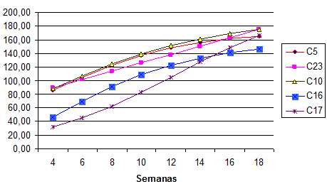 El material 16 que muestra un peso inferior a todas desde la semana 4ta, mantiene un incremento constante, se iguala con los otros ecotipos desde la semana 12 y solo alcanza a las 18va semanas el valor mayor, por encima de los 300.00 g.