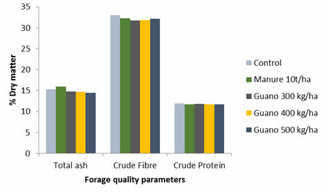 Mean CP, ash and CF contents were almost identical across treatments. Pholsen et al (2005) reported that crude protein content of Signal grass treated with cattle manure at the rate of 3,12 and 6,25 t ha-1 was similar to the control but higher at the rate of 12,5 and 25 t ha-1. Colla et al (2004) reported a linear relationship between leaf N concentration at blooming stage of potato and guano-based organic fertilizer rates. Mohammad et al (1988) reported that Nitrogen fertilizer increased crude protein and ash percentage of Elephant grass.
