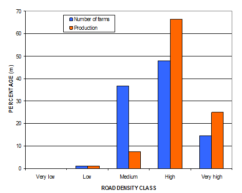 | Figure 14. Percentage of poultry farms and their production across various road density classes. |
