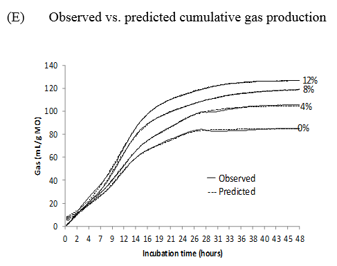 At the end of the incubation period (between 45 and 48 hours of incubation), the exponential and France model overestimated gas production for all crude glycerol levels, while the logistic model overestimated gas production for the crude glycerol levels of 0 and 4% and underestimated gas production for the levels of 8 and 12%.