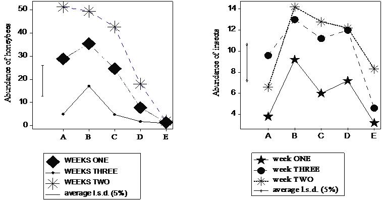 The abundance of other insects (outside honeybees) was the highest at the second and third week. This might be due to reduced competition for floral resources from honeybees at the third week or the insects visiting the flowers might have some other mission outside pollen and nectar collection. Garibaldi et al (2013) mentioned that honeybees compete with other insect pollinators for floral resources.