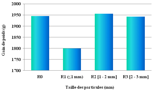 A la fin du démarrage, le poids vif des poulets du lot témoin sans patate (R0) et du lot R3 qui contenait les plus grosses particules [2-3 mm] de patate ont été comparables et significativement plus élevés que ceux des lots R1 et R2 nourris avec de la farine de fines particules (≤1 mm) et de granulométrie moyenne [1-2 mm]. Par ailleurs, tout comme la consommation alimentaire, au démarrage comme en finition, le poids vif et le gain de poids de poulets ont augmenté avec la taille de la granulométrie de la patate dans la ration, le meilleur gain de poids ayant été enregistré avec la farine de granulométrie comprise entre 1 et 2 mm (Figure 1).