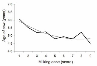 Milk let down is a well known physiological process controlled by both hormones and nerves. Suckling or milking are common stimuli that induce milk let down. Indirect effects that contribute to the release of milk are attributable to the milking environment (human or machine) or the temperament of the cow. Docility therefore as a dairy cow trait, allows for ease in handling and, by extension, ease in milking (Gergovska et al 2014). Zebu dairy cattle are considered generally aggressive, however, adjustment in cow handling during milking could improve this trait (Becker and Lobato 1997, Rushen et al 1999), inferring that docility could be more of a conditional trait than genetic. The link of docility (temperament) and milk traits has been a subject of investigation. Praxedes et al (2009) observed that farmers that adopted milking in the presence of a calf did not experience problems with milking ease or temperament. Munksgaard et al (2001) indicated that differences in docility did not reflect on milk yield or milk composition alluding to an opinion that temperament may not necessarily impact adversely on milk traits. This opinion differed in some measure to an earlier study by Rushen et al (1999) that showed adverse effects of irritation on milk yield. However, it should be noted that milking ease is also a function of age as shown in Figure 3 (Praxedes et al 2009), a factor that may have contributed to differences observed in various experiments.