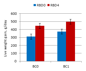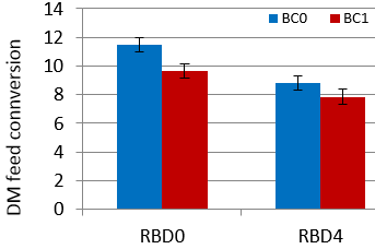 DM intake as percent of live weight was increased both by RDB and biochar although the effects were small (3% and 6% for biochar and RDB, respectively; Table 2, Figures 1 and 2).